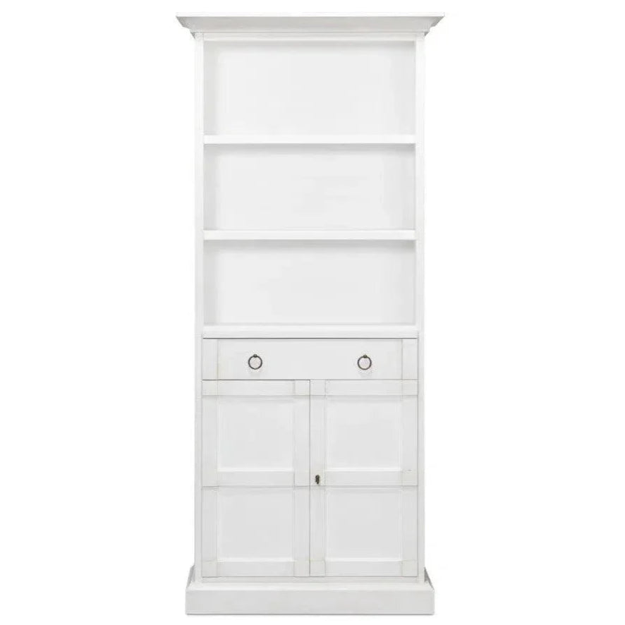 Expertly crafted from solid pine wood with a soft cortina white finish, our Bookcase With Doors and Drawer Cortina White adds a touch of breezy charm and concealed storage to any room. Hand-distressed to display authentic imperfections such as splits, cracks, and nail holes from its prior life, this bookcase is not only durable but also showcases its rustic character. With three adjustable shelves and open storage space, it provides ample room for organizing and displaying your items. A versatile and charming addition to any home, this bookcase offers both style and functionality.