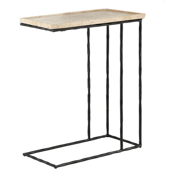 The Boyles Travertine C Table has a forged iron base in a black finish that holds a tray top made of solid, unpolished travertine. The personality of the surface stems from the fact that it is porous and has a variety of nooks and crannies in its pitting. Inherent variations in the stone's texture, veining, and color from pale ivory to a warm tan are to be expected and celebrated. Each surface is unique so no two are exactly alike.