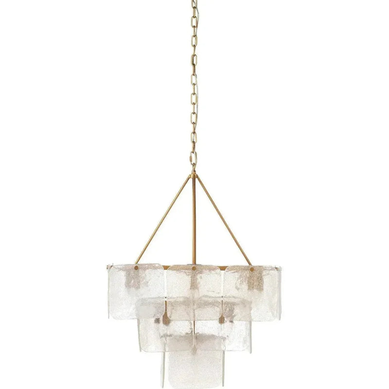 Enhance your space with the ultimate in luxury and refinement through the Brass & Glass Foyer Perignon Three Tier Chandelier. The stunning, organic shapes created from flawless glass are perfectly complemented by the rich, antique brass frame. Densely bubbled glass adds depth and character to any room, making this chandelier a true high-end masterpiece. Organic squares, created from intricately bubbled clear glass, gracefully adorn the warm, antique brass frame, forming three tiers of unparalleled design. The lavish finishes perfectly contrast the raw shapes, resulting in a true statement piece. Meticulously crafted from clear glass, this chandelier boasts unique, organic squares that bring dimension to any space. The antique brass finish on the frame adds a touch of luxury that flawlessly complements the natural shapes.