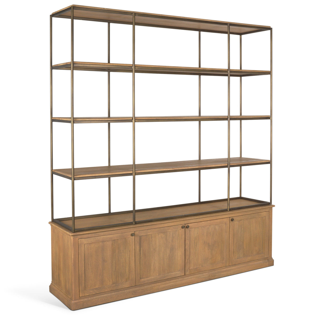 The Braxton Light Brown Wood Shelving Unit offers a perfect blend of style and function, making it a valuable addition to any spacious room. Crafted from smooth, solid mango wood, this shelving unit showcases a light brown finish that adds warmth to any setting. The fine sandblasted finish enhances its natural beauty while the rounded aged, patinaed brass-finished iron hardware provides a refined touch. With its four-door cabinet and four-tiered design, it offers ample space for both display and organization, allowing you to showcase your favorite items or store essentials neatly.