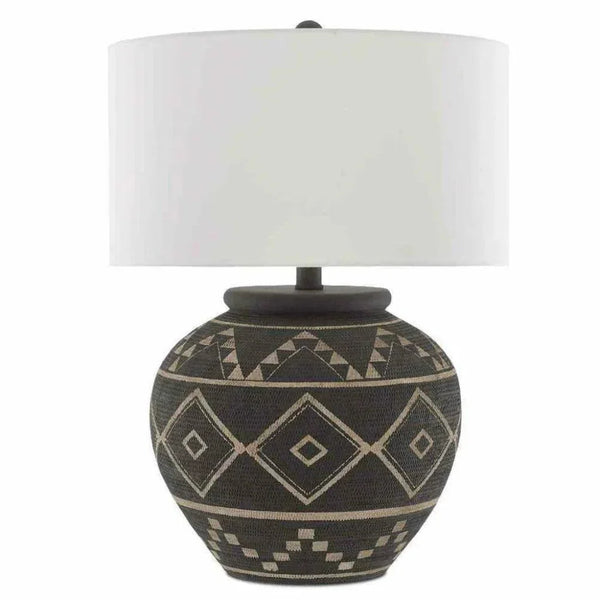 The Tattoo Table Lamp has a surface covered in basket-weave, a pattern that is scratched from the brewed latte finish on the terracotta body. The wrought iron hardware in a Mole black finish fits perfectly with the tones on the dark gray lamp, which has a terracotta finial in a matching finish to fasten the off-white linen drum shade to the piece.