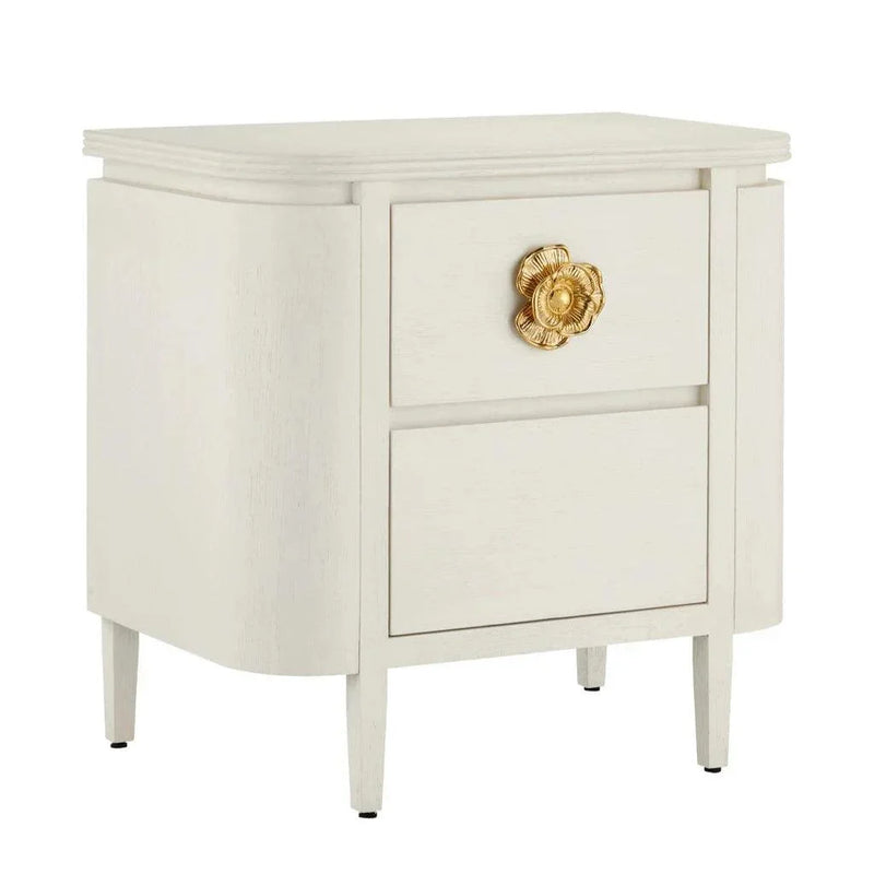 The brass floral motif and gold flower pull on cerused white oak showcase the skill of our artisans, who hand-cast each handle. With soft-close drawers, the Briallen White Nightstand is both a beautiful decorative piece and a practical addition to any bedroom. Elevate your space with this elegant and functional furniture from our exclusive brand.