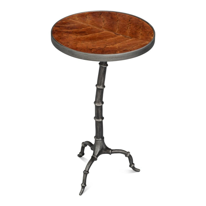 The Brightleaf Side Table combines art and functionality, adding a unique touch to any room. Its cast aluminum base features a rich pewter finish that gives it a sculptural look inspired by nature. The table's round top is crafted from real tobacco leaves, providing an organic feel. This piece is artisan-made, ensuring each table is unique and honors a rich history and community craftsmanship. Its compact size makes it perfect for small spaces, offering a stylish surface for your essentials. The blend of brown and grey tones allows it to fit seamlessly into various decor styles, making it a versatile addition to your home.