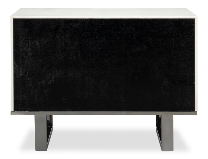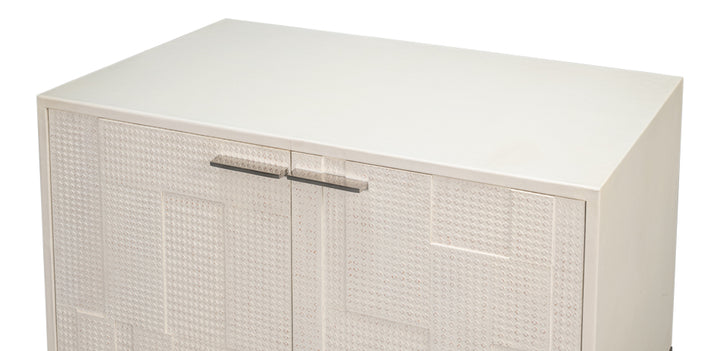 The Bronzini Cabinet is a sleek and stylish storage solution for any home. With a leather-covered exterior, it features slightly raised diamond patterns on its doors, adding a touch of elegance. The cabinet stands on a sturdy iron base with a stainless finish, giving it a modern look. Its dual doors are equipped with stainless steel handles, providing easy access to the interior with a natural wood finish. This piece is perfect for those looking to add a bit of class and functionality to their living space. Its transitional style and white color make it a versatile addition to any room.