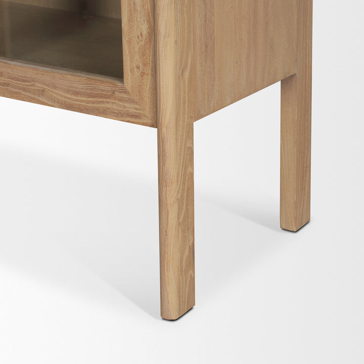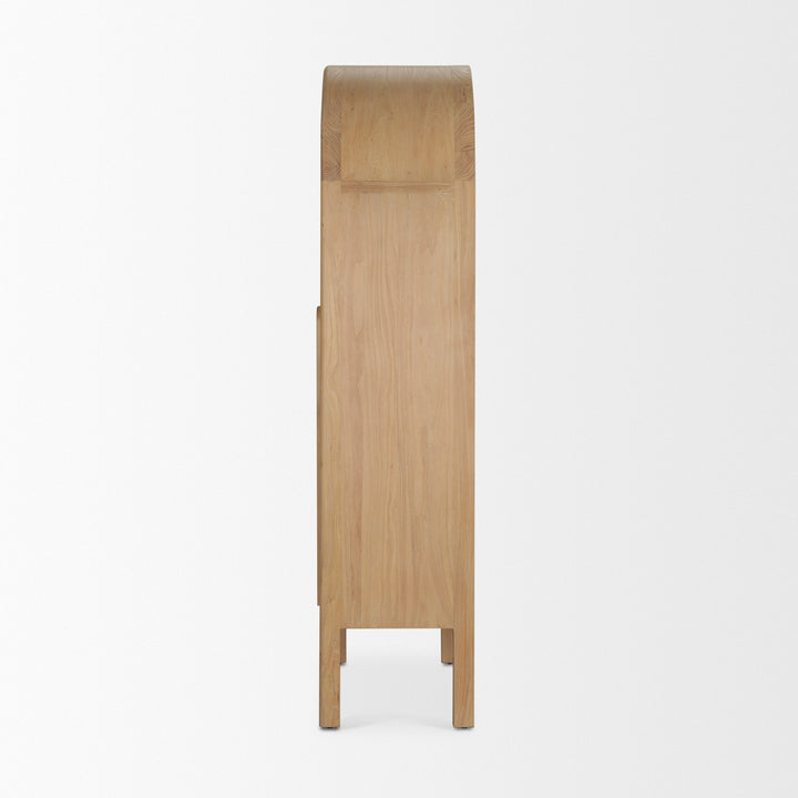 The Callum Wooden Light Brown Arched Bookcase With Glass Doors is a perfect blend of timeless craftsmanship and modern style. Made from solid elm wood with a durable elm veneer, its light brown stain with a subtle white wash creates an inviting look that complements any decor. The elegant arched design and clear glass doors add a touch of sophistication, while two long wood pulls mirror the cabinet's graceful curves. This combination of materials and design features ensures that the bookcase not only looks great but is also built to last.