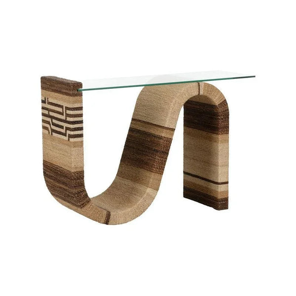When you need a console table that makes a statement without overwhelming your space, the challenge lies in finding something visually striking yet proportionally balanced. The Wildwood Calusa Curve Glass Top Console Table is a 45.75-inch Contemporary asymmetrical console built for entryways and living rooms that demand sculptural presence, available at LOOMLAN with free shipping to the continental US. This distinctive piece features a natural brown abaca rope base wrapped in an artistic curved form, topped with suspended tempered glass that appears to float above the organic foundation. Wildwood's approach to this design eliminates traditional legs entirely, creating a waterfall effect where the rope base flows seamlessly from floor to tabletop height.