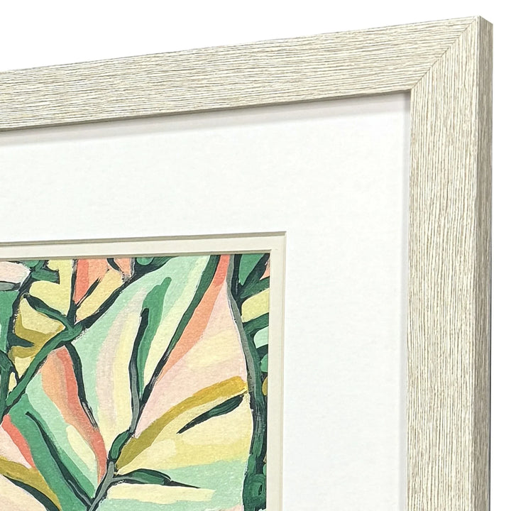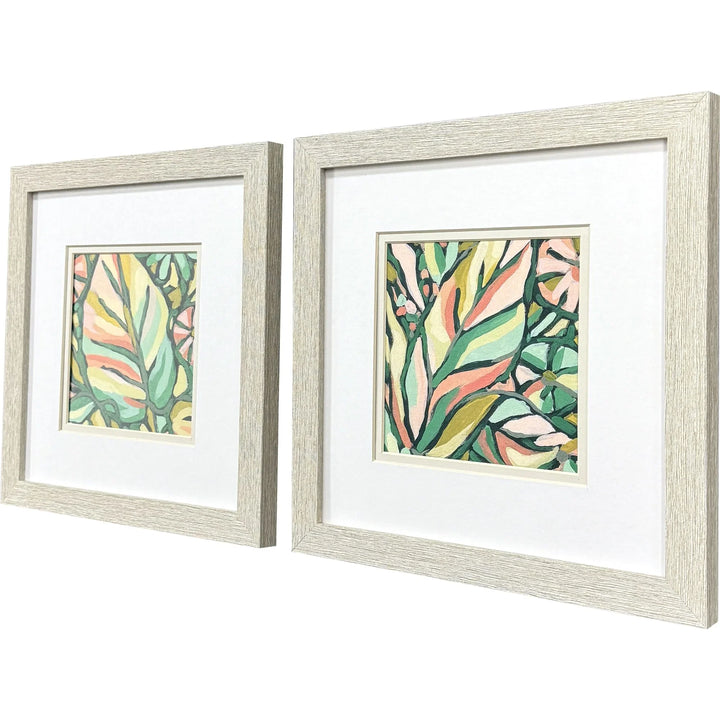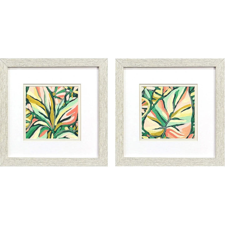 Bring a breath of fresh air and a splash of color to any room with the Candy Tropicals Set of 2 Coastal Art With Glass Front. These vibrant Framed Wall Art pieces feature delightful pink and green tropical leaf prints that add a whimsical touch to your decor. Each print is matted in a subtle white and light buff, perfectly complementing the lively hues of the artwork. The frames have a charming distressed whitewash finish, adding a coastal vibe to these modern art pieces. The set is ideal for brightening up spaces and making a statement on any wall.
