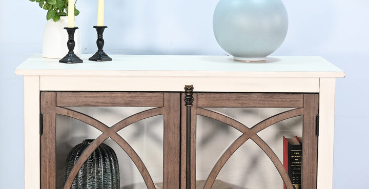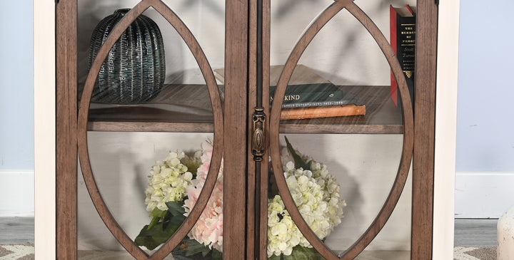 Constructed from high-quality Mahogany wood, this accent cabinet features a beautiful two-tone design. The elegant glass doors with unique wood patterns add a touch of sophistication to any room. Inside, a shelf offers convenient space for organizing and displaying your essentials. Its modern style and thoughtful design make it a perfect fit for various home decor themes. Whether used alone or paired with other furniture, it enhances your living space effortlessly. The craftsmanship ensures durability, while the white finish complements your decor seamlessly. No assembly is required, making it a hassle-free addition to your home.