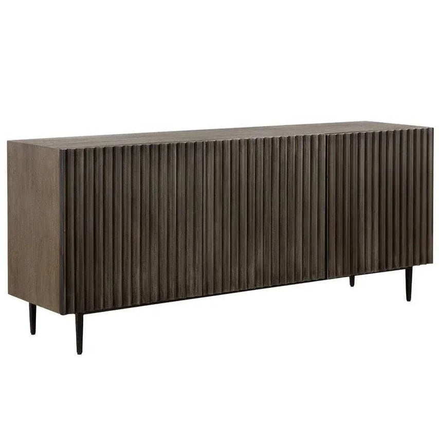 This bold sideboard will command attention through dining, living and lounge spaces. Features a grey mango wood frame with dramatic sculpted details on the face of the two cabinets. Steel legs complete the urban and contemporary look. Made in India. With refined craftsmanship, this design was brought to life by skilled local artisans. By nature, these materials develop unique imperfections such as fissures, markings and colour variations for a truly one-of-a-kind piece. As wood is an organic, porous material, these pieces will contain natural variation of texture and may also exhibit fine indentations and cracks. Wood pieces will also display a disparity of colour and grain, and visible knots and burls that add to the character of each piece.