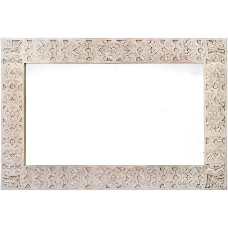 Crafted with precision and elegance, this versatile mirror is made from durable mango wood and finished with a water-resistant lacquer in a white wash finish. Expertly hand-carved and routed, it is a stunning showcase of skilled artistry. The frame is constructed using tongue and groove joint methods for superior strength and durability. Add a touch of timeless beauty and sophistication to your living space with the Feyloren Solid Wood Mirror.