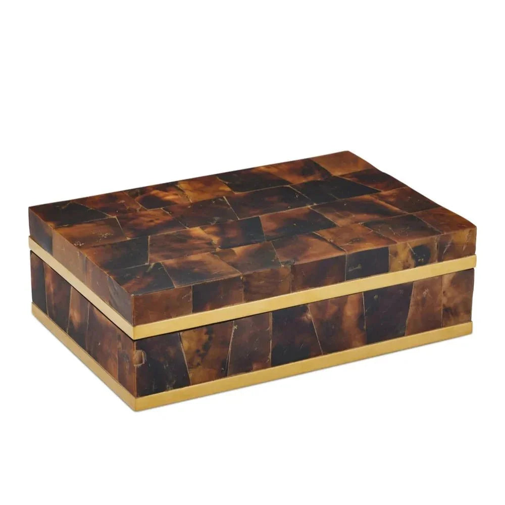 The Casey Brown Box is a perfect blend of craftsmanship and elegance, crafted with care using natural pen shell pieces. These pieces are meticulously applied, forming a puzzle-like surface that adds a sophisticated touch to any room. The polished finish brings out the depth and warmth of the brown tones, making it a standout piece in the contemporary style category. The box is adorned with brass-finished stainless steel rims that complement the natural hues while adding a touch of luxury. Though sealed for protection, it is designed for indoor use and should not be used to hold water.