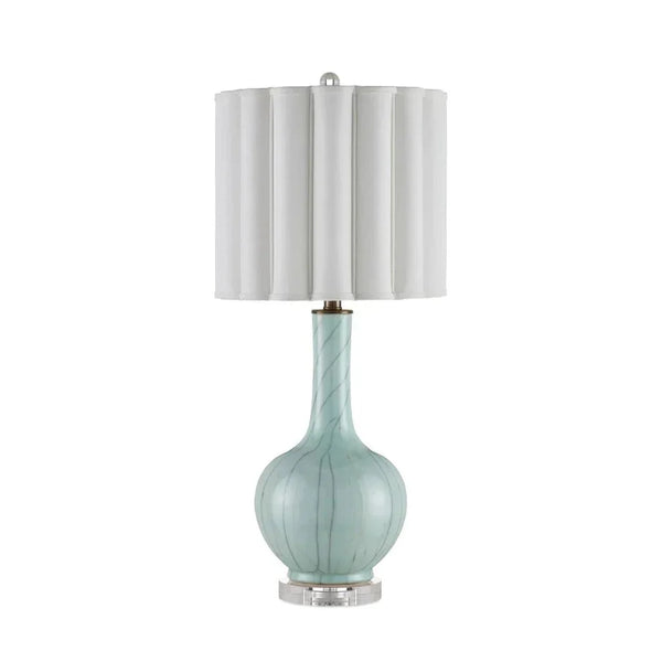 The Celadon Crackle Table Lamp adds a touch of elegance to any room with its beautiful porcelain vase-shaped body. The lamp's celadon crackle finish creates a unique look, making each piece special with its own pattern. This lamp is perfect for those who appreciate traditional style with a modern twist. Its pale blue hue complements a wide range of interiors, while the optic crystal base provides a touch of sophistication. The lamp's scalloped shade, secured with an optic crystal finial, enhances its overall appeal, adding a refined touch to your home decor.