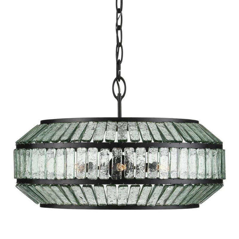 The Centurion Recycled Glass Chandelier from Currey Co. showcases eco-friendly materials and a sophisticated design, making it a modern and flexible option for lighting. The elongated panes of recycled glass are seamlessly integrated into rings made of wrought iron, finished in satin black, resulting in a polished and luminous look. Whether in a modern farmhouse, traditional, or transitional setting, this chandelier hangs from an aircraft cable, giving the impression of floating. With its sleek and versatile design, this chandelier is perfect for any space, featuring elongated recycled glass panes expertly incorporated into satin black wrought iron rings.