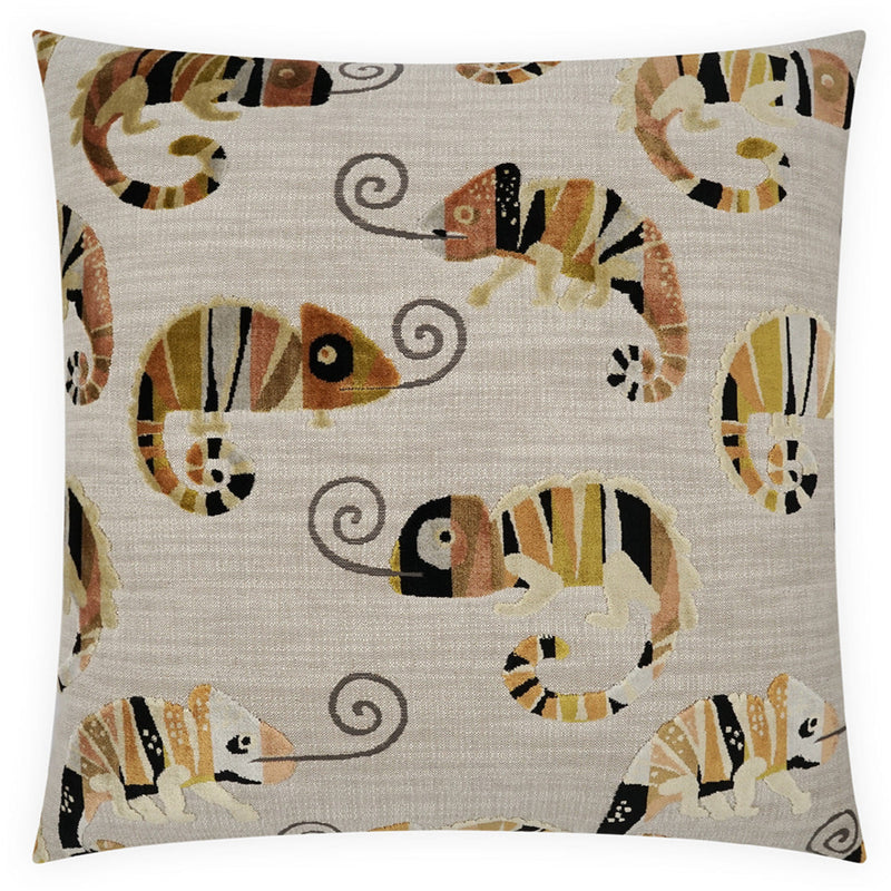 The Chameleon Pillow Handcrafted With Removable Cover offers a playful touch to any room with its vibrant chameleon pattern. This square cushion adds a splash of color with shades of beige, orange, yellow, and black, making it a fun addition to any decor. Made with a blend of polyester, viscose, and cotton, it ensures comfort and durability. The insert is filled with a mix of feathers and down for a plush feel. The cover and insert are removable, making cleaning easy, and the hidden zipper gives it a neat look. Handcrafted in California, each pillow is cut and sewn to order, adding a personal touch to your home.