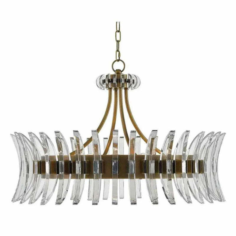 Transform your space with the opulent Antique Brass Coquette Chandelier. This modern Art Deco masterpiece boasts slices of optic crystal and antique brass, emitting a warm-cool glow that exudes sophistication. The crystal blades and half-moon slivers elevate any room, creating a stunning showcase for your home decor. Indulge in the timeless elegance of our Coquette Chandelier, a modern take on Art Deco artistry featuring slices of optic crystal and metal in an antique brass finish. The crystal blades, resembling half-moon slivers, add a luminous warm-cool touch of glamour to this luxurious fixture.