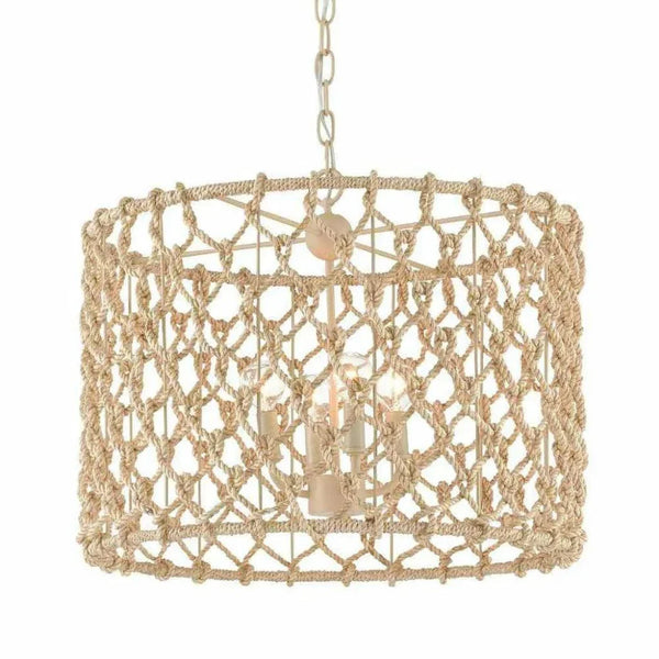 Currey & Company Chesapeake Natural Rope Drum Chandelier is a 21-inch contemporary coastal drum chandelier designed for dining rooms and living spaces 10x12 feet or larger, available at