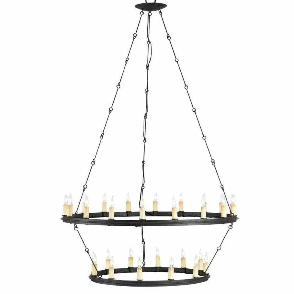 The lightness of its design makes the size and scale of the Toulouse Chandelier surprising. Two tiers of flattened iron bands form rings that hold the fixture's thirty lights. A Blacksmith finish completes the restrained profile of this exceptional black chandelier. A design note on the Toulouse is how dainty the chain design reads for such a large chandelier. It features an impressive thirty lights and a Blacksmith finish that add elegance to any room. Its two tiers of iron bands create a delicate yet striking design, making the Toulouse Chandelier a remarkable addition to any space.