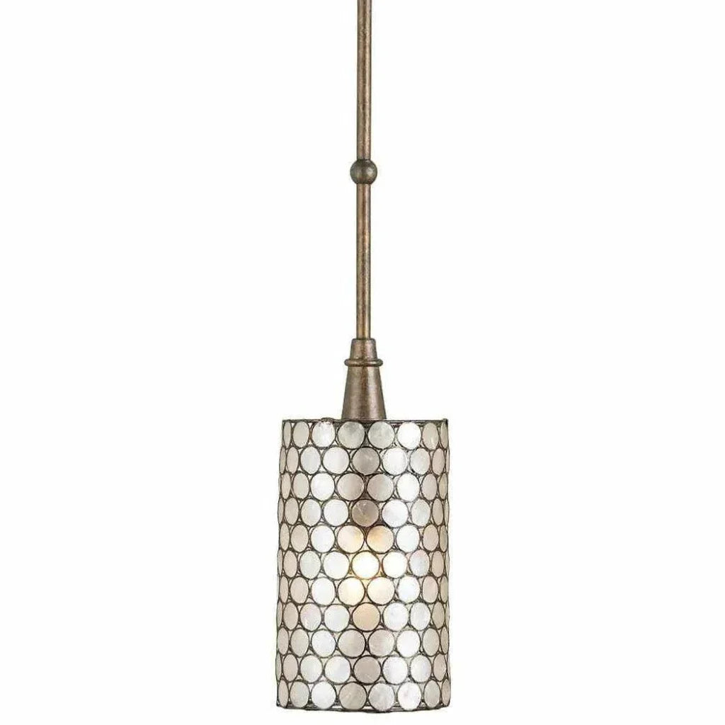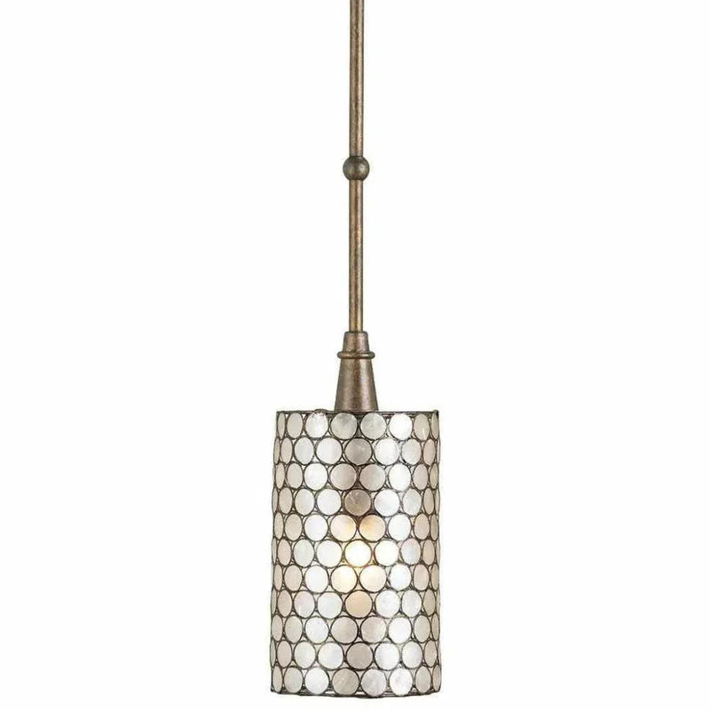 Natural Capiz shell and wrought iron in a Cupertino finish create a luminous circular pattern on the shade of the Regatta Pendant. The cylindrical pendant has such a pleasing glow when light shines through the lustrous shade. Given its petite size, the shell pendant is perfect for grouping or hanging in rows. Adjustable from 22" to 49" with use of included chain/rod kit/cable. If your space calls for a longer drop, additional chain/rods/cable is available for purchase.