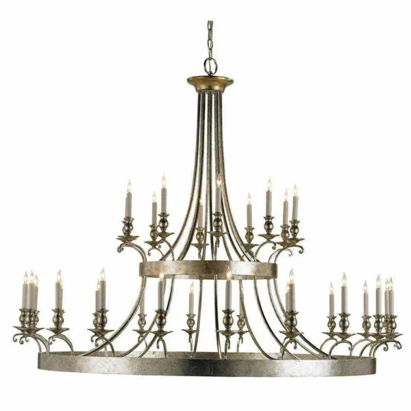 Grand hotels and estate dining rooms with double-height ceilings need chandeliers that command attention without overwhelming the architecture -- a delicate balance of scale, material authority, and visual impact. The Currey & Company Granello Silver Leaf Lodestar Chandelier is a 65-inch contemporary wrought iron round chandelier with mixed silver leaf and antique gold leaf finishes, designed for grand dining rooms and two-story foyers with 10-foot ceilings or higher, available at LOOMLAN with free shipping to the continental US.