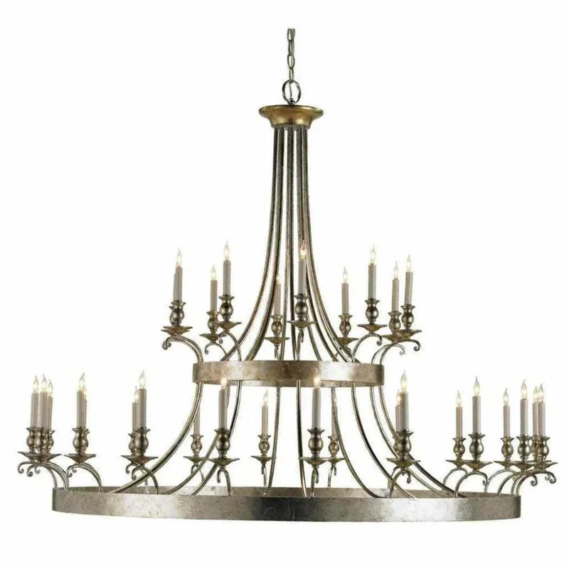 Indulge in the epitome of opulence and refinement with the Granello Silver Leaf Antique Gold Leaf Lodestar Chandelier. This lavishly designed chandelier features an intricate wrought iron structure, embellished with exquisite silver and gold leaf accents. Boasting thirty lights and delicately-detailed wooden bobeches, it is a true masterpiece that radiates luxury and exclusivity. The Lodestar Chandelier, crafted in wrought iron with Granello silver leaf and antique gold leaf finishes, showcases broad circular bands that support elegantly-curved spokes.