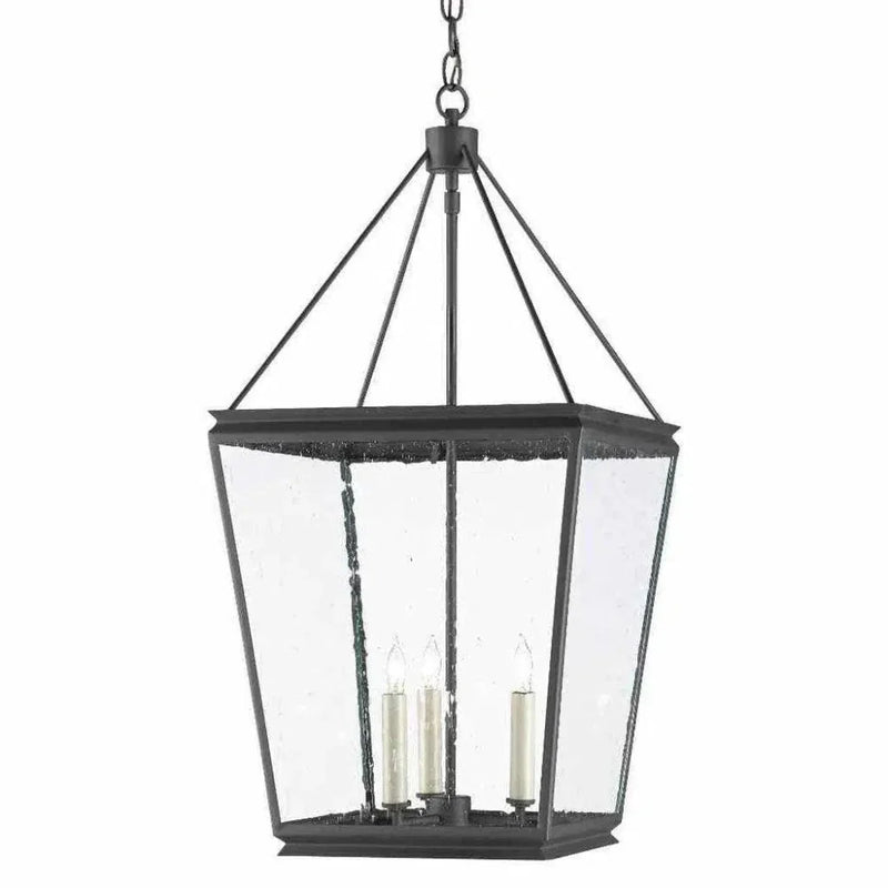 The Ellerman Lantern is a tried-and-true design that reflects the age-old lantern shape, which never goes out of style. Made of wrought iron in an old iron finish, the black lantern is fitted with seeded glass panels to complete the feel that this is a fixture rooted in Americana. Adjustable from 32" to 104" with use of included chain/rod kit/cable. If your space calls for a longer drop, additional chain/rods/cable is available for purchase.