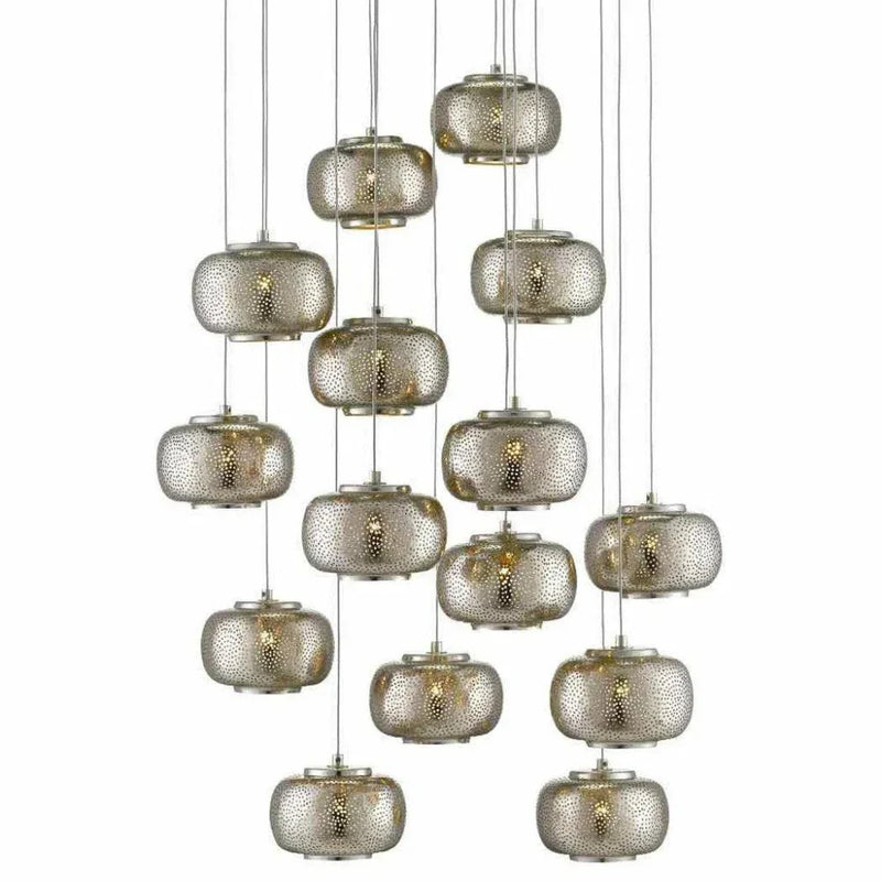 Our Pepper Round 15-Light Multi-Drop Pendant has pierced metal shades in a mix of painted silver and nickel finishes. The textural metal orbs are on point for modern farmhouse and industrial chic interiors. The canopy of this piece is luminous in a painted silver finish. This fixture is among Currey & Company's multi-drop pendant collection, which includes multiple configurations.
