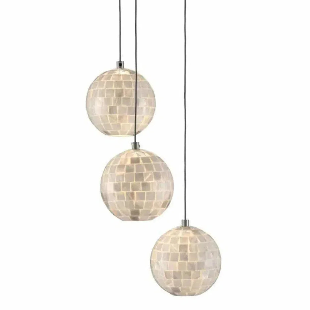 The Finhorn 3-Light Multi-Drop Pendant has orb-shaped shades covered with small squares of mother of pearl, painstakingly hand-applied. The canopy of this piece is luminous in a painted silver finish. This fixture is among Currey & Company's multi-drop pendant collection, which includes multiple configurations.