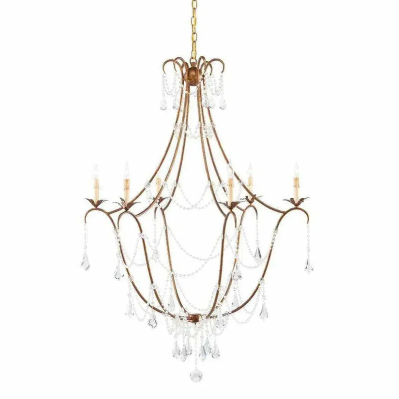 Our Elizabeth Gold Chandelier has an airy iron frame draped with tasteful crystal accents. Teardrops and beaded stands adorn this six-light chandelier in a Rhine gold finish to bring luminosity to its formal chandelier shape.