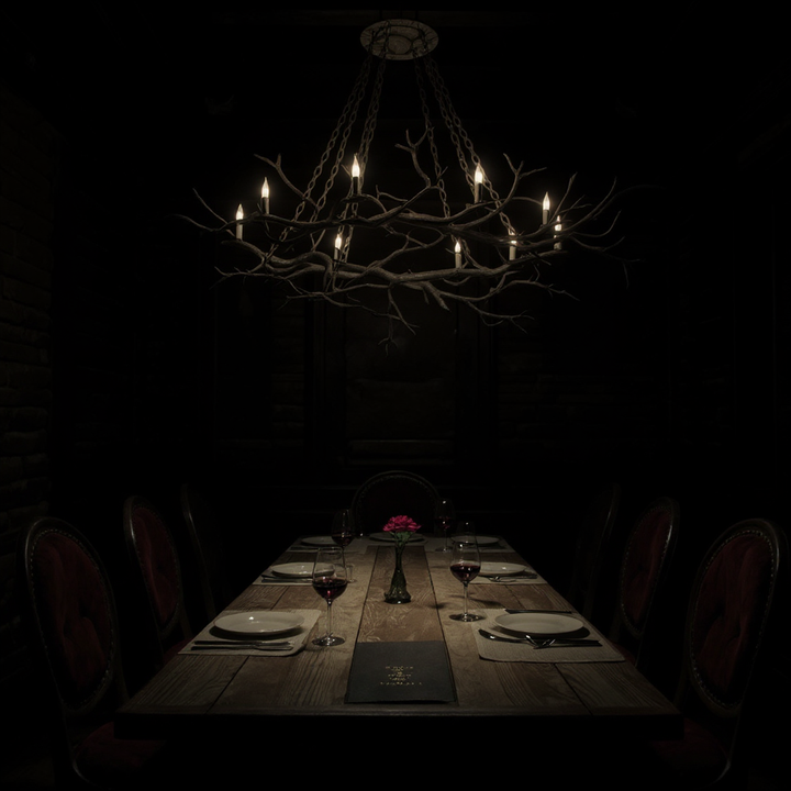 This chandelier is absolutely stunning above solid wood dining tables, especially those in rich walnut, oak, or reclaimed barn wood that echo the natural, organic feel of the branch design while creating beautiful harmony between the rustic bronze finish and natural wood grains. It works magnificently with live-edge tables where the raw, natural edges celebrate the same organic beauty as the chandelier's lifelike branches, or with farmhouse-style tables in distressed finishes where the hand-forged iron adds authentic artisanal character. The rustic bronze pairs beautifully with warm wood tones like cherry or mahogany, and it's equally gorgeous with painted tables in deep forest greens, warm creams, or weathered grays where the bronze finish provides rich metallic contrast that feels both sophisticated and grounded in nature.