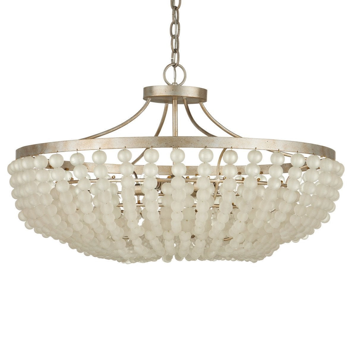 The Chanteuse Semi-Flush Mount adds a touch of elegance to any room with its eye-catching design. It features two cascading rows of ivory glass beads that vary in size, all supported by a sturdy wrought iron frame. The frame is finished in a sophisticated Silver Granello, providing a chic and refined look. This lighting fixture not only enhances the décor but also creates a warm atmosphere with its soft, diffused light. Its versatile design allows it to fit seamlessly into various spaces, whether installed as a semi-flush mount or a chandelier.