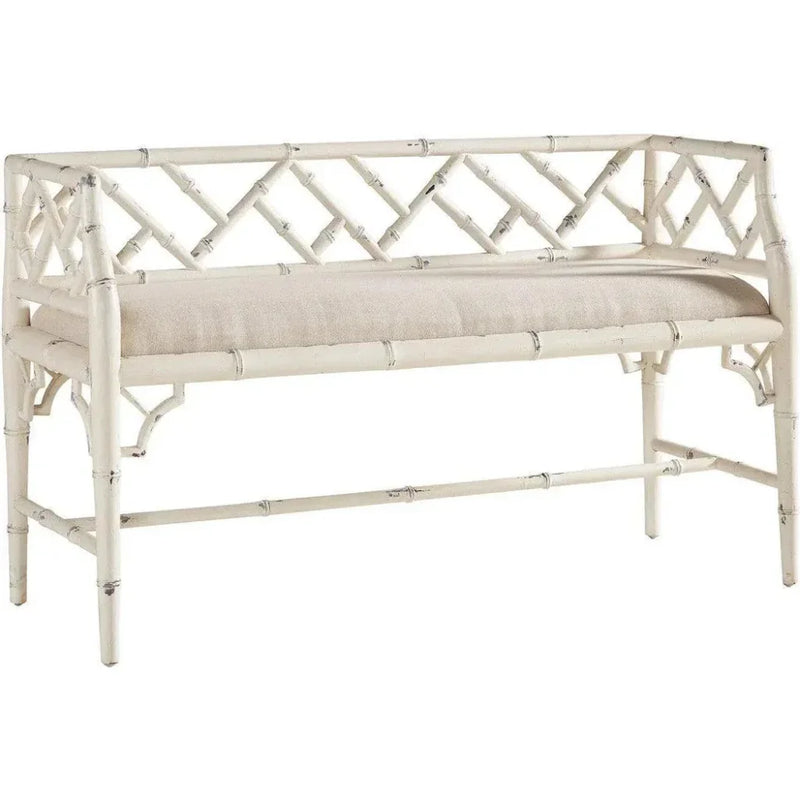 Perfectly scaled to rest at the foot of your bed or in an entry way, this charming beauty is sturdy enough for two! The solid mahogany is turned to replicate bamboo, and then painted a softly distressed white. The drop seat is upholstered in a neutral linen, but is easily reupholstered to enhance your decor.