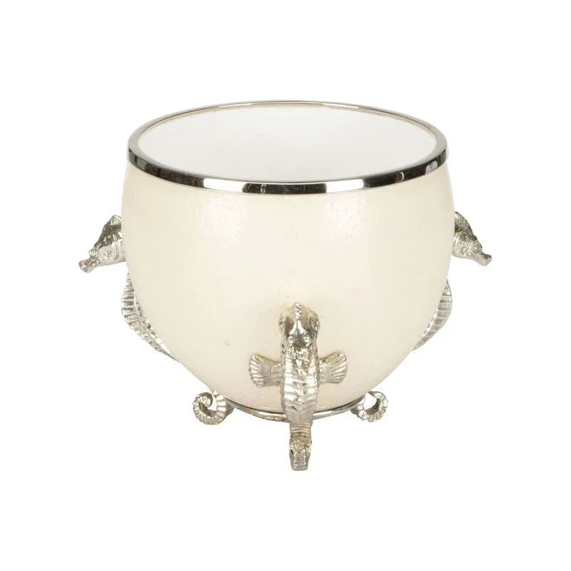 Add a touch of elegance to your home with this unique decorative object. Featuring silver-plated seahorses gracefully arranged around a natural ostrich egg, this piece is both eye-catching and sophisticated. The smooth texture of the egg pairs beautifully with the intricate details of the silver seahorses, creating a piece that is both playful and refined. Perfect for any surface, this decorative item enhances the charm of your living space, whether it’s displayed on a shelf, table, or mantelpiece. The Charmer Decorative Object with Seahorse Elegance is crafted from high-quality materials, ensuring both durability and beauty. The cream-colored ostrich egg provides a soft contrast to the gleaming silver details, adding depth and interest to your decor.