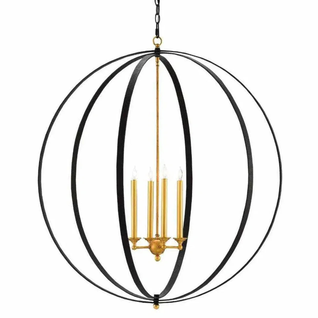 The Ogden Orb Chandelier has a time-honored shape we've contemporized. The open globe specific to traditional chandeliers has a minimalistic design with this fixture. The intermingling of chinois antique gold leaf and black finishes adds an elegant touch to the clean-lined black chandelier. Adjustable from 43.25" to 112.25" with use of included chain/rod kit/cable. If your space calls for a longer drop, additional chain/rods/cable is available for purchase.