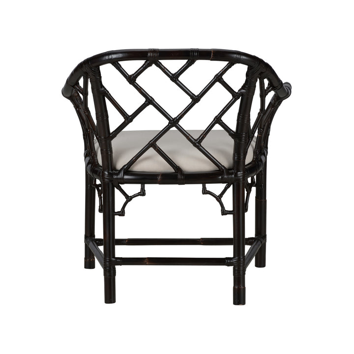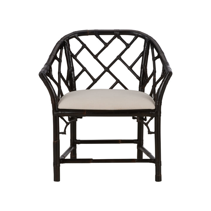 This elegant arm chair adds a touch of classic style to any room. Made from sturdy rattan, it features a beautiful geometric lattice design that stands out. The chair's black-brown color gives it a modern look, while the curved armrests offer both comfort and style. The beige cushioned seat provides a cozy place to sit, making it perfect for relaxing or entertaining guests. The rectangular legs ensure stability, supporting the timeless Chippendale style. This chair is a great choice for those who want to combine natural texture with a refined look, enhancing any living space with its sophisticated design.