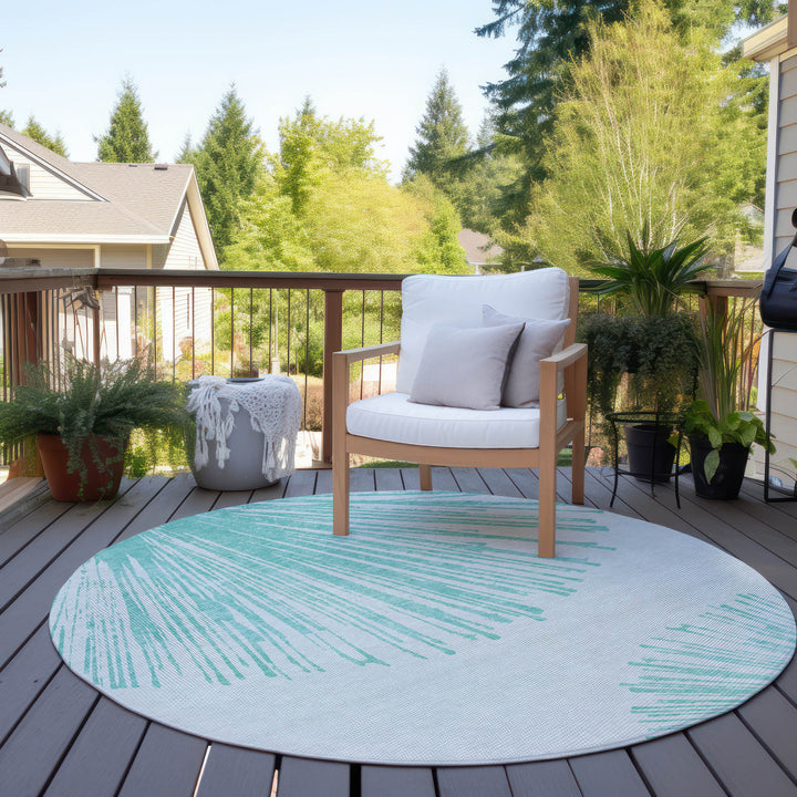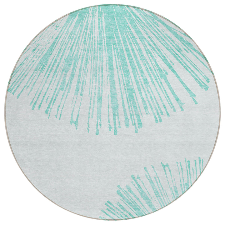 Step into a circle of fun with this transitional rug, designed to bring a lively atmosphere to any space. The oversized spokes pattern adds excitement to your living room or patio. It's crafted with UV-stabilized colors, ensuring long-lasting beauty whether indoors or outdoors. The ultra-thin design features a non-skid backing, eliminating the need for an extra rug pad. Cleaning is a breeze with its machine-washable material, and its polyester construction makes it both family and pet-friendly. This rug offers style and convenience, making it a must-have addition to your home.