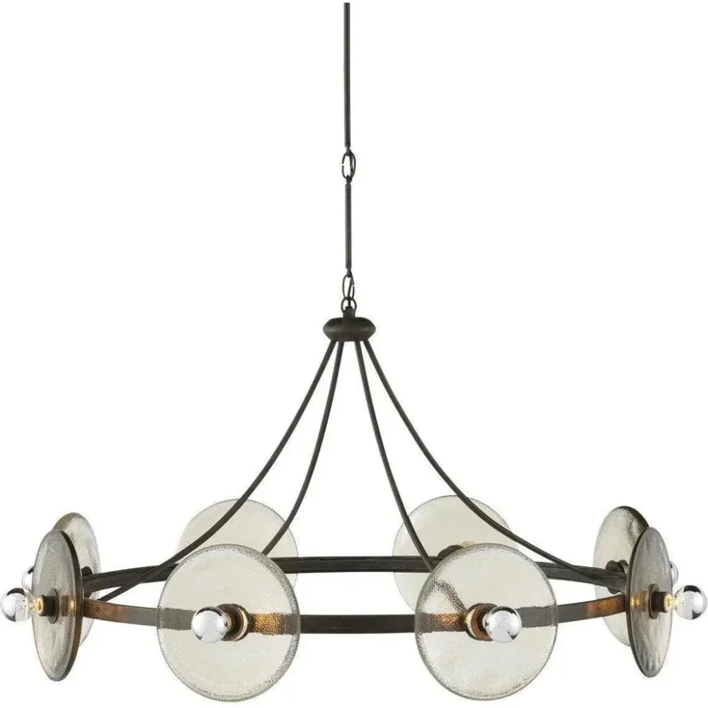 Introducing the Circumstellar Disc Chandelier - a Tom Caldwell design that exudes sophisticated illumination. Each cast glass disc showcases a unique pebbly surface, creating layers of texture and depth. The wrought iron frame, finished in black iron, offers a striking contrast. For a soft, glare-free radiance, pair the chandelier with recommended reflector bulbs, transforming it into a true work of art. The Circumstellar Disc Chandelier, designed by Tom Caldwell, boasts textured cast glass discs and a recycled wrought iron frame in black iron finish.