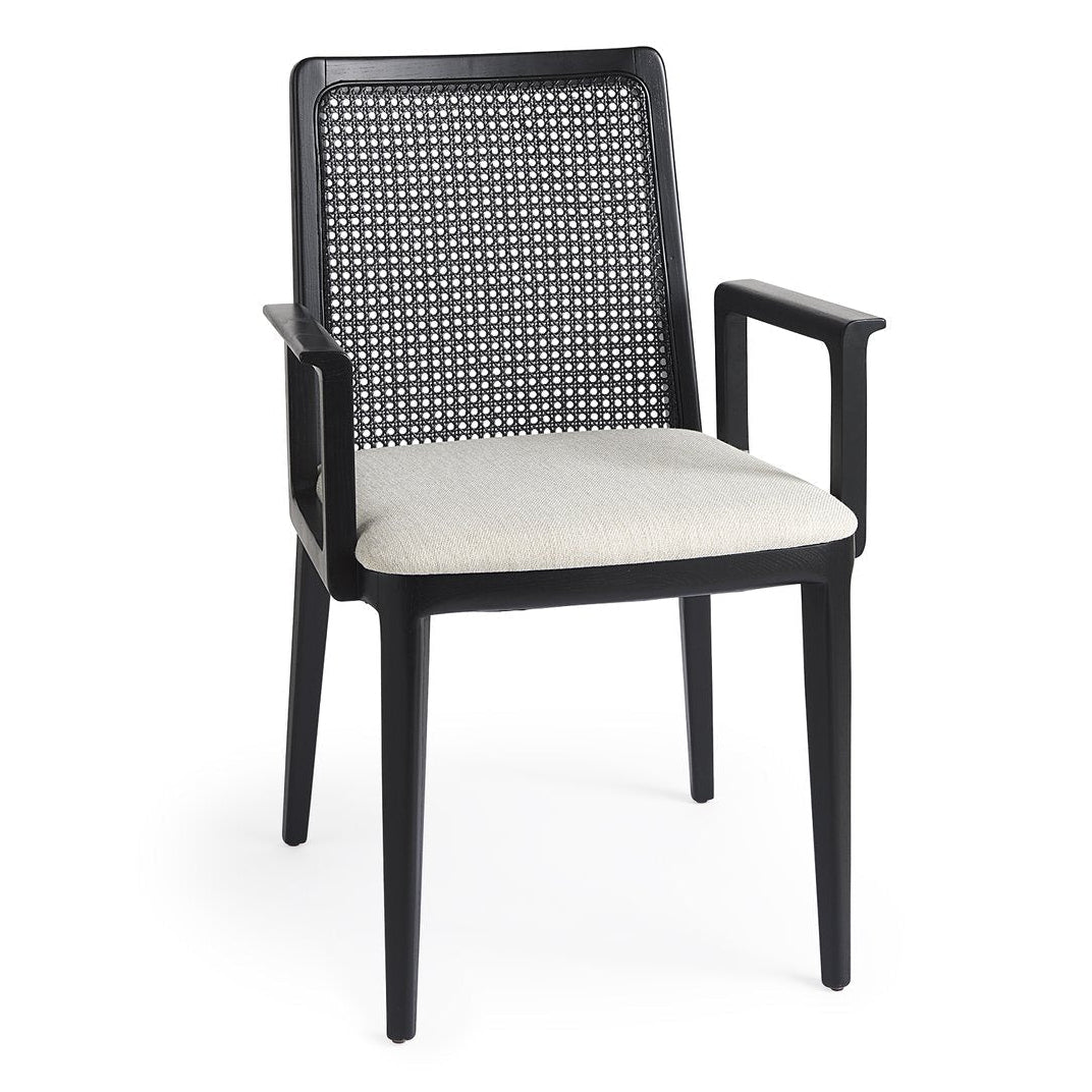 Solid wood defines the Clara Black Wood Dining Chair with Cream Fabric Seat, offering a sleek black finish that pairs beautifully with its gently flared arms. The woven cane back introduces a touch of texture, creating a stunning contrast that stands out in any dining space. Soft cream upholstery adds an inviting and refined look, making this chair suitable for both casual meals and more formal gatherings. This combination of materials not only ensures durability but also provides a balance of classic and contemporary style, making it a versatile addition to your home. Plus, since it comes fully assembled, you can enjoy it right away without any hassle.