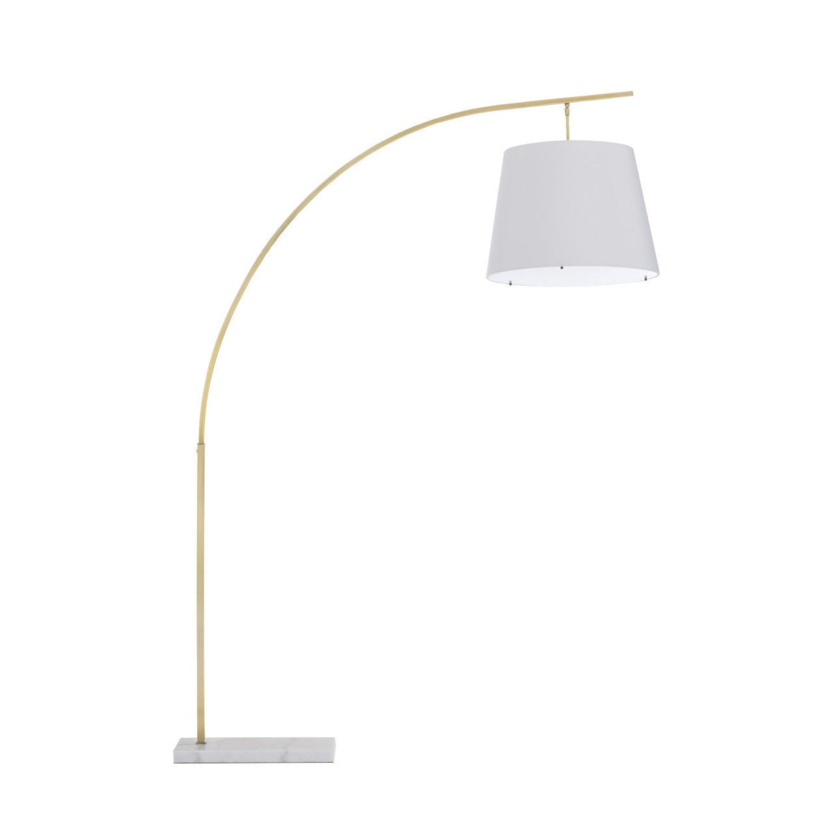 The angular arc of the stem on the Cloister Large Floor Lamp, the way the shade dangles, and the minimal shape of its base are design details that make it an exemplar of contemporary design. The clean way the stem is fastened to the base and the pared-down lines of the white linen shade enhance the gold and black floor lamp's modernity. The acrylic diffuser fastened by the petite button finial is a clever aspect to this design.