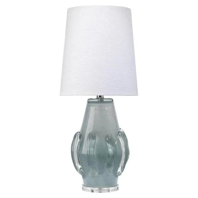 Illuminate your space with the exquisite handblown art of the Coastal Style Blue Glass Talon Table Lamp. Available in cornflower blue or clear glass, the lamp features thick ribbons of handblown glass around the body, making each piece one-of-a-kind. With a clean white linen shade and acrylic details, this lamp adds elegance and style to any room. The Talon Collection table lamp handblown art glass base is topped with a clean white linen cone shade and an acrylic ball finial and an arcylic base. Available in cornflower blue or clear glass, each is elaborately adorned with thick ribbonsof more handblown glass around the lamps body. True works of art; no two will be identical.