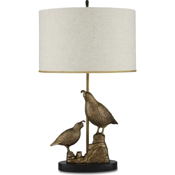Crafted from cast aluminum in an antique brass finish, the pair of quail and rocky ledge sit atop a honed black marble base. The natural linen shade with gold foil lining, featuring glimmering gold trim, adds warmth and opulence.