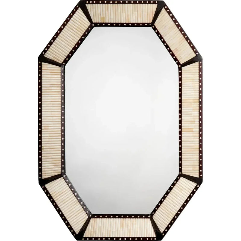 This handcrafted mango wood Colony Mirror features a unique octagonal frame adorned with bone inlay. Expert craftsmanship meets timeless elegance, resulting in a true work of art that can be hung vertically or horizontally to add light and dimension to any room. Elevate your home with this timeless piece. The timeless look of this handcrafted mango wood wall mirror is enhanced with a unique octagonal frame accented using the ancient decorative tradition of bone inlay. Sure to be cherished for generations, it can be hung vertically or horizontally to add light and dimension to any room of your home. Expert craftsmanship meets timeless elegance. This mirror is adorned with an octagonal frame crafted from hand-carved mango wood and embellished with bone inlay, making it a true work of art.