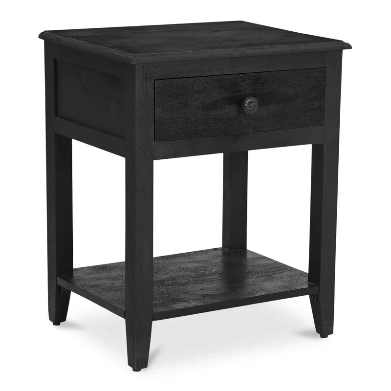 The Corrine nightstand introduces a touch of elegance and practicality to any bedroom. Its antique black finish pairs perfectly with a floral metal handle, providing both charm and function. Constructed from sturdy mango wood, it promises durability while maintaining a vintage allure. The nightstand's minimalist design ensures it fits seamlessly into various decor styles, enhancing the beauty of your space without overwhelming it. This nightstand is designed for those who appreciate both style and utility. The metal side-mounted glides ensure smooth operation of the drawer, while the floral detail on the handle adds a unique, artistic touch. Its compact size makes it ideal for smaller spaces, offering a practical solution for storing essentials like books, glasses, or a bedside lamp.