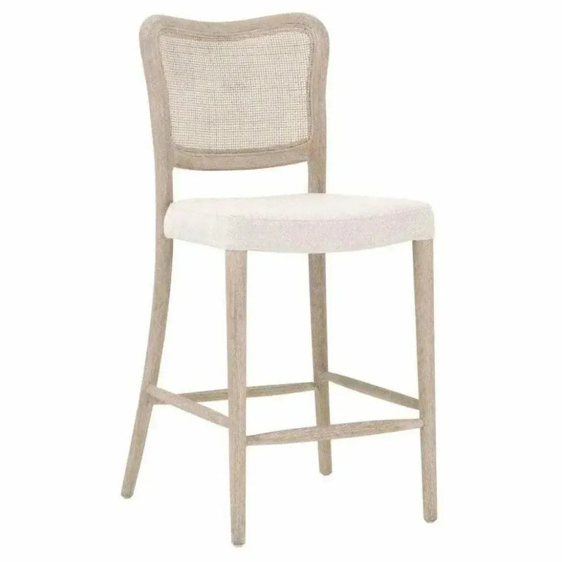 Immerse yourself in the opulent splendor of the Cela Counter Stool Bisque. Meticulously handcrafted with a robust solid wood frame and delicate cane back, this stool exudes transitional style and adds a gorgeous touch to any room. Its natural fabric upholstery features inherent variations in dye lot, lending an exclusive appeal. From the coveted Stitch and Hand Collection, renowned for its unparalleled artistry and precision. The Cela Counter Stool Bisque, in Natural Gray Oak with a cane back, embodies transitional elegance with its sturdy solid wood frame and intricately designed upholstered seat. Natural fabric finishes may exhibit dye lot variations, further enhancing the stool's allure. This remarkable piece is a testament to the exceptional craftsmanship of the esteemed Stitch and Hand Collection.
