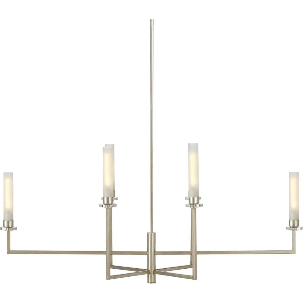 Introduce a touch of opulent modernity to your space with the Courante Silver Chandelier from Currey Co. Expertly crafted from metal with a champagne finish, this elegant chandelier features squared arms that gracefully balance optic crystal bobeches and frosted glass candle sleeves. Designed by Ian Thornton, the oblong shape provides perfect illumination for rectangular tables or kitchen islands. Elevate your space with the sophisticated and exclusive Courante Silver Chandelier from Currey Co.