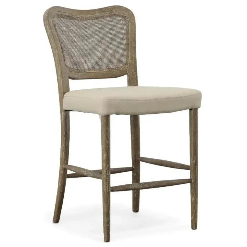 The gracefully curved back adds elegance, while the caned back offers a unique touch. The cushioned seat, upholstered in neutral performance linen, allows for a quick bite or an extended chat. Elevate your dining space with this solid oak stool that's perfect for those who embrace risk and aren't afraid to make a statement.