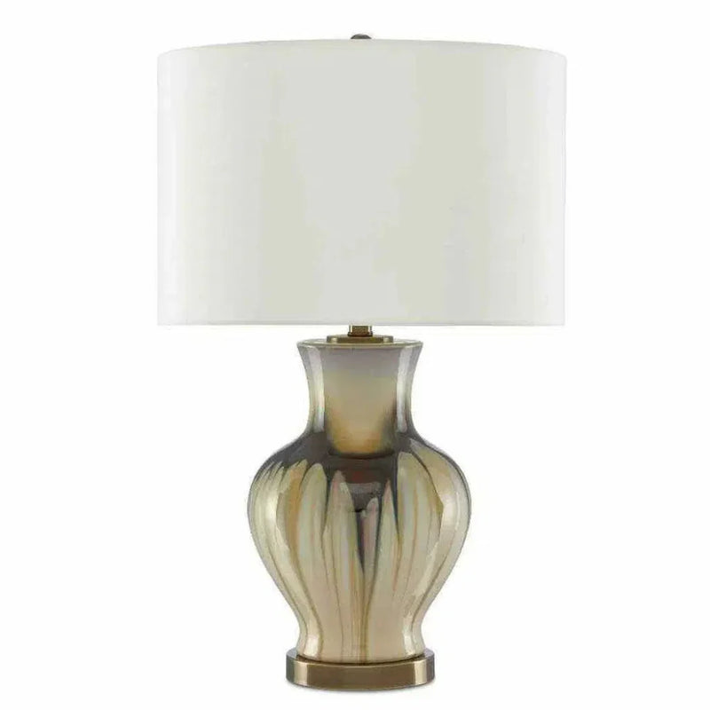 Elevate your home decor with our Muscadine Table Lamp. Dripping with personality, this elegant piece features cream and brown porcelain paired with antique brass hardware. The off-white shantung drum shade adds a touch of refinement, making this lamp a striking and sophisticated addition to any space. Indulge in the warm and luxurious experience it brings.