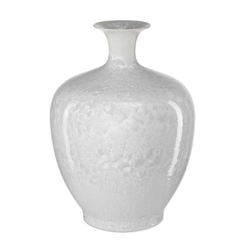 The Crystalline White Vase captures the eye with its stunning and unique look. This vase is made from mouthblown porcelain and features delicate crystalline bursts on its surface. These bursts create a shimmering mother-of-pearl effect that glows softly in the light. Each vase is unique, as the pattern and placement of the crystalline designs vary. This makes it not only an elegant piece but also a one-of-a-kind decor item that stands out in any room.