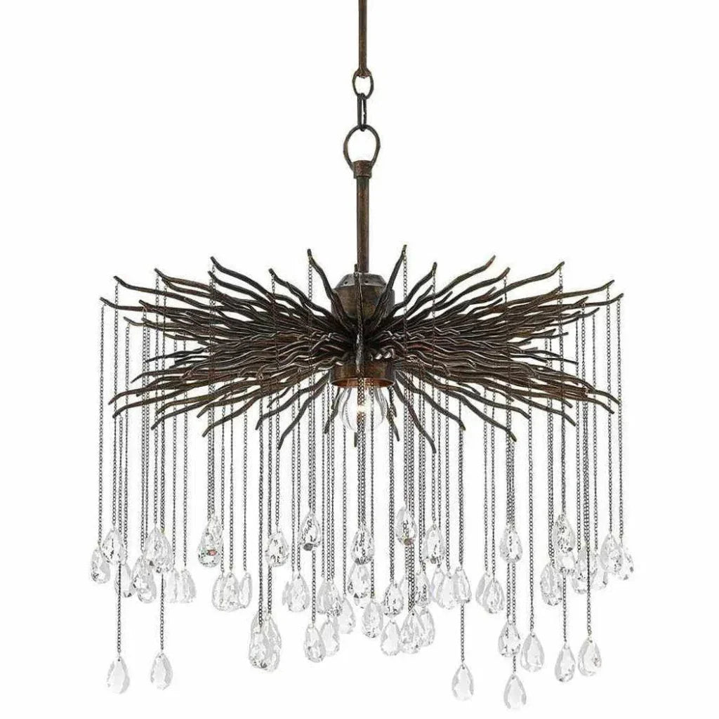 Enhance your surroundings with the Fen Small Chandelier. Constructed of wrought iron, its twisted limbs exude a raw beauty and resilience. Adorned with brilliant crystals, each chain exudes a touch of refinement. Finished in bronze, this brutalist design radiates an exclusive and sophisticated allure. Also offered in a larger size for a more impactful statement. The Fen Small Chandelier, with wrought iron limbs that reach out like twisted branches, offers a natural and raw appeal. Each chain supports a delicate crystal, adding a touch of elegance to the design.