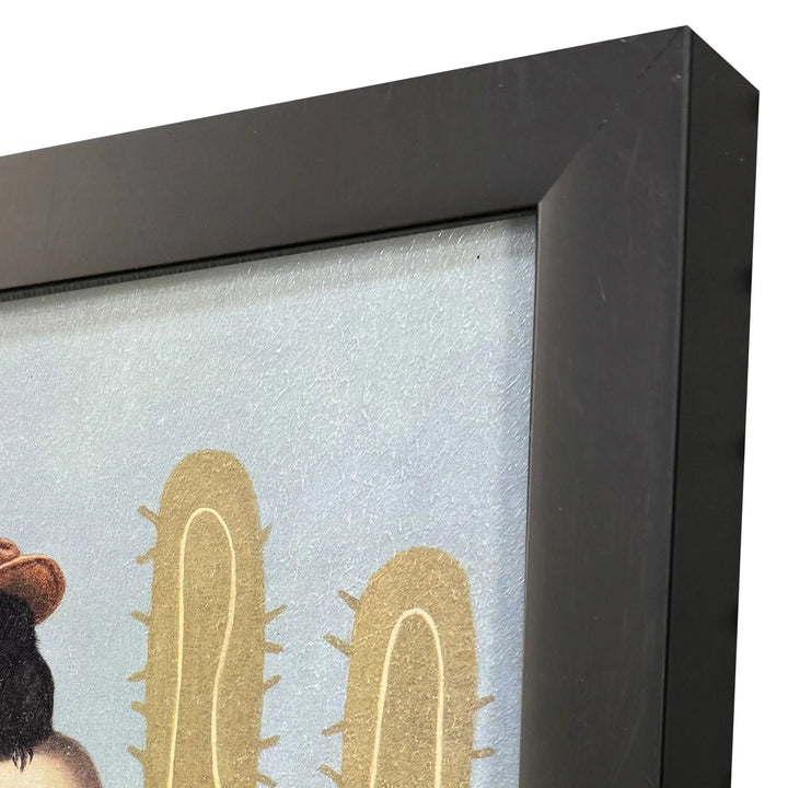 Add a touch of humor to your space with this quirky piece of art. Featuring a playful animal print, the artwork brings a smile to anyone who sees it. The dog in a cowboy hat, complete with a smoking cigar and a black bird perched on top, creates a whimsical scene. The vibrant background of green cacti, a blue sky, and a yellow sun adds color and charm to any room. The Curly II Framed Wall Art is designed to complement casual settings with its unique character and style.