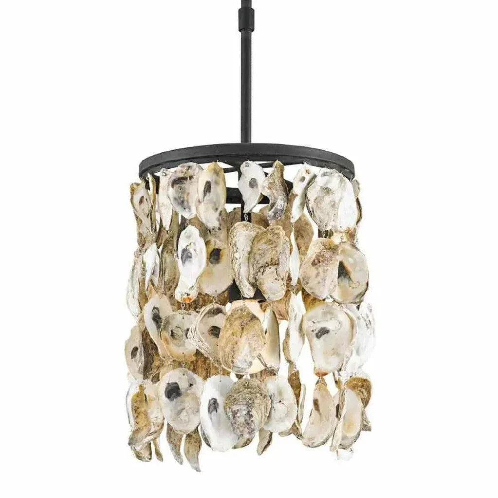 Introducing the Blacksmith Natural Oyster Shell Stillwater Pendant - an exquisite and versatile addition to any home. Crafted by our expert design team, each hand-selected oyster shell delicately hangs from a wrought iron frame in a blacksmith finish, embodying the delicate beauty of the ocean. For an even more luxurious touch, it is also offered as an oval chandelier. Bring the sophistication of the sea into your space with the Stillwater Pendant.